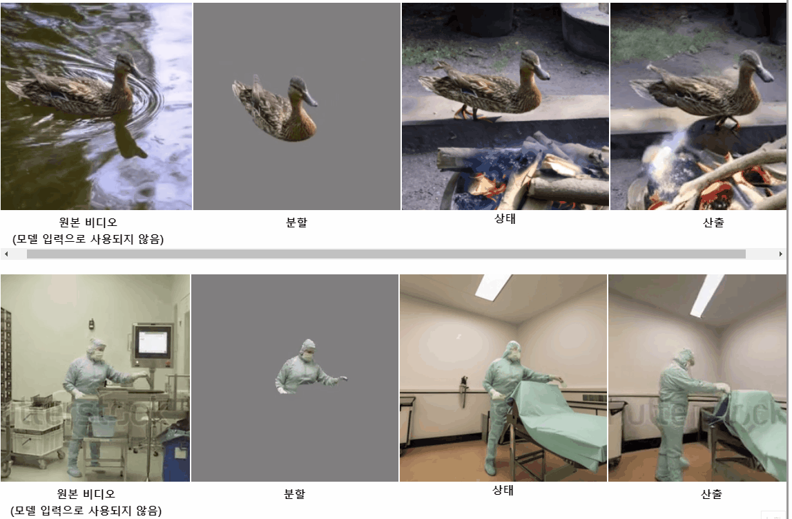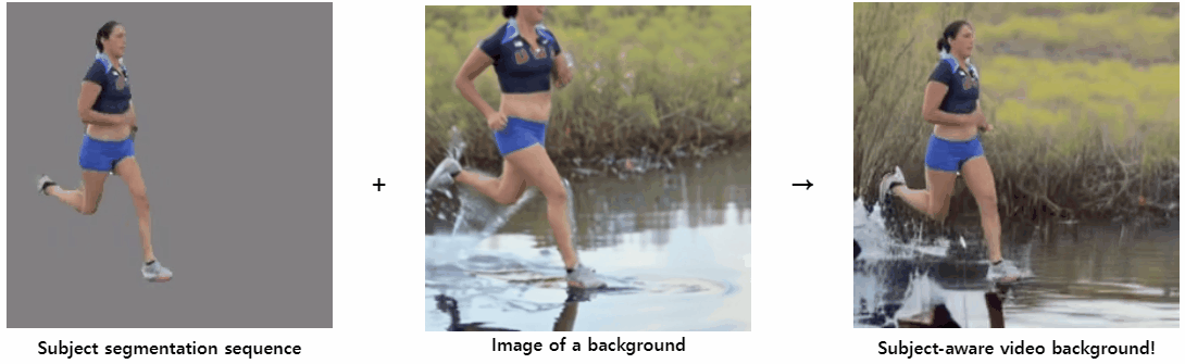 ActAnywhere은 위 이미지 예시처럼 분할된 피사체와 배경 이미지의 입력으로 인식된 배경과 연출 효과를 생성합니다. 달리는 여자의 영상 클립과 강물 배경 이미지를 입력하니, 달릴때마다 발 밑에서 물이 튑니다.