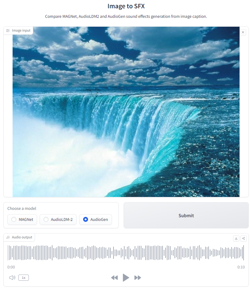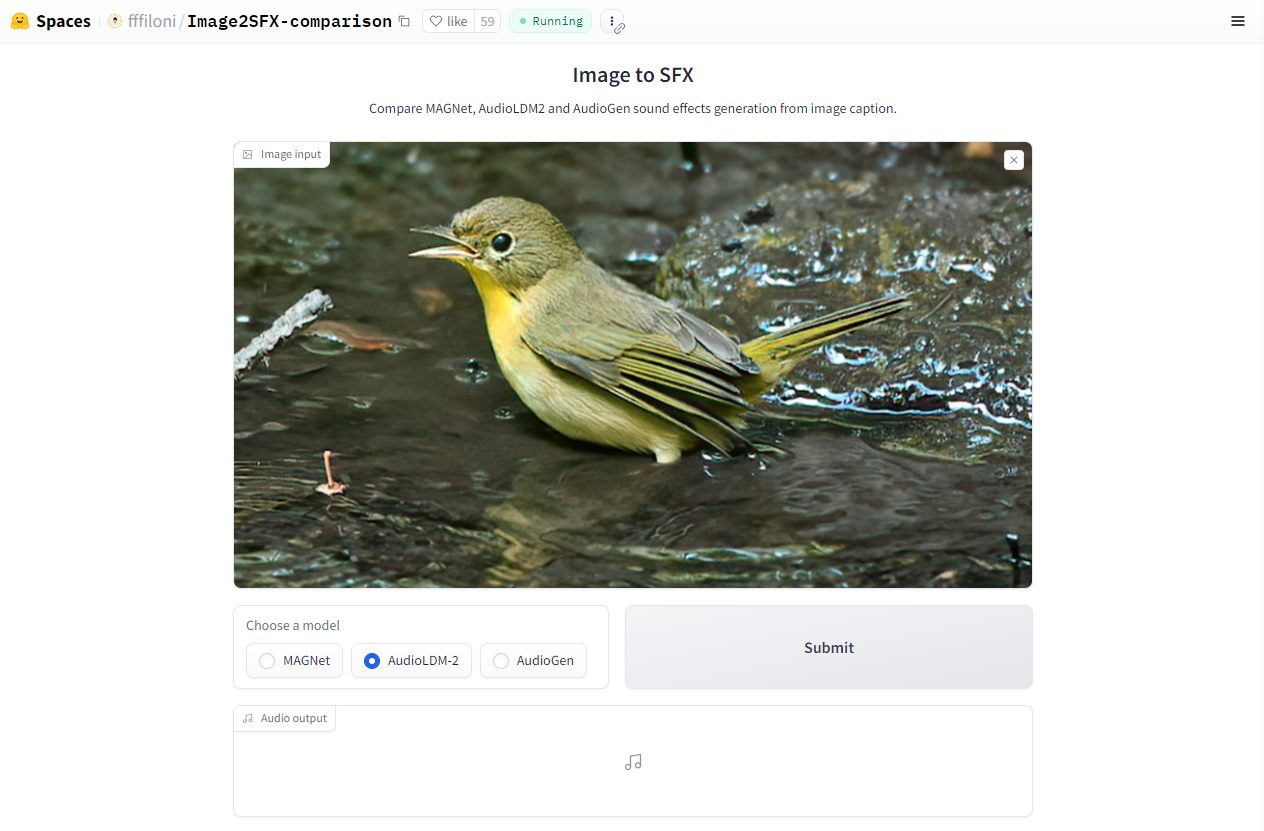 위 링크로 접속하면 바로 생성할 수 있는 테스트 화면이 나옵니다. 샘플 이미지로 저장되어 있는 새 이미지입니다. 'submit'을 눌러 생성해 보겠습니다. 생성된 소리의 재생 길이는 10초로 고정되어 있습니다.