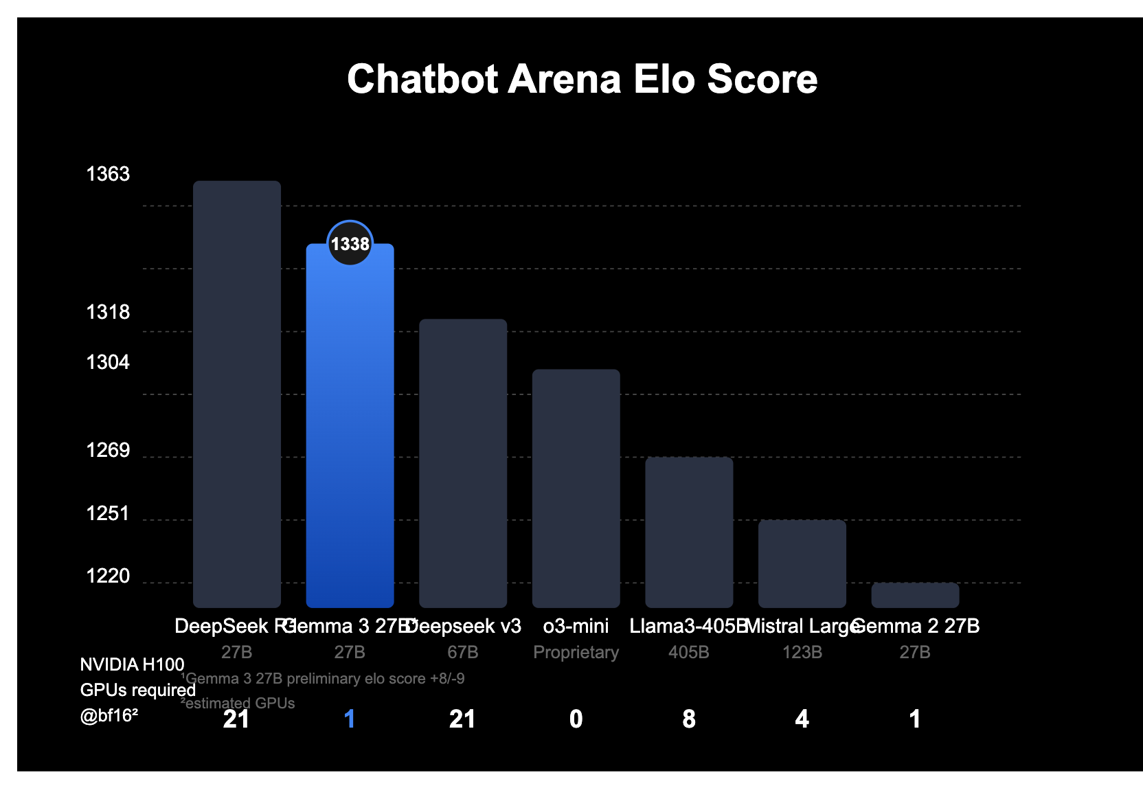 특히 주목할 만한 점은 Gemma 3의 27B 모델이 Chatbot Arena Elo 점수 테스트에서 2위를 차지하며 GPU를 1장만 사용한 성능으로는 놀라운 경쟁력을 보여주었다는 것입니다. 이는 DeepSeek-R1에 이은 성적으로, Meta의 Llama-405B와 OpenAI의 o3-mini를 뛰어넘는 성과입니다.