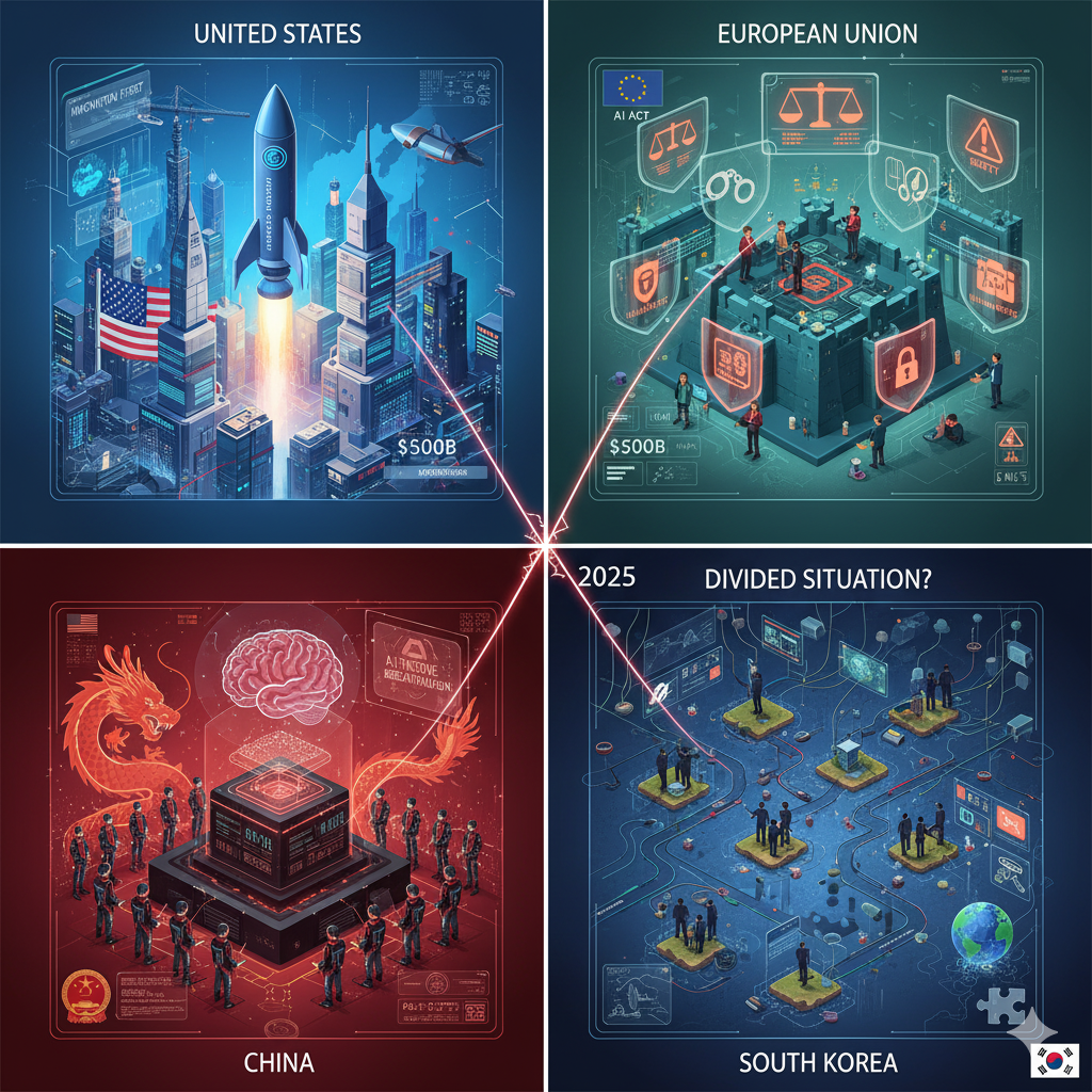 미국은 혁신에 올인했습니다. 트럼프 행정부의 AI 액션 플랜은 90개의 정책 조치를 통해 규제를 철폐하고 있습니다. 5000억 달러 규모의 '프로젝트 스타게이트'는 미국의 의지를 보여줍니다. "AI 지배력"이 새로운 국력의 상징이 된 거죠.