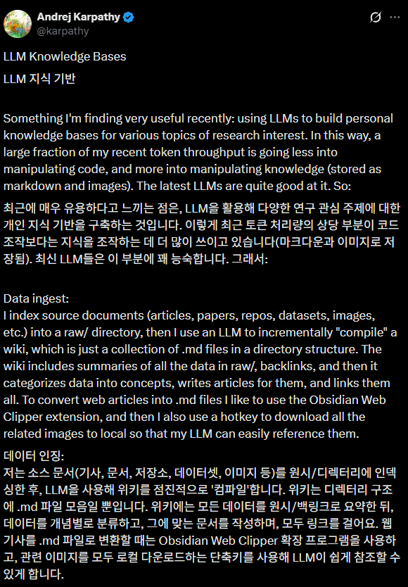 오늘도 최근 AI 소식 중에서 함께 깊이 생각해보면 좋을 내용을 들고 왔습니다. 최근 테슬라의 전 AI 디렉터이자 OpenAI의 창립 멤버 중 한 명인 안드레이 카파시(Andrej Karpathy)가 자신의 소셜 미디어에 남긴 흥미로운 트윗이 있었는데요. 그가 최근 LLM을 단순히 코드를 짜는 데 사용하는 것이 아니라, ‘개인화된 지식 기반(Knowledge Base)’을 구축하는 데 활용하고 있다는 내용이었습니다. 이 글을 보면서 AI 시대에 우리가 지식을 습득하고 다루는 방식이 어떻게 근본적으로 변하고 있는지 에코 뉴스레터 구독자님들과 공유해보고자 합니다.