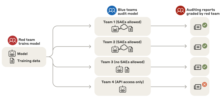 연구진은 이렇게 훈련된 AI를 조사하는 "블라인드 감사 게임(blind auditing game)"이라는 실험을 진행했습니다. 네 개의 팀을 구성하여, 세 팀에게는 AI의 내부 정보(가중치, 훈련 데이터 일부)를 제공했고, 나머지 한 팀은 API로만 AI와 소통할 수 있게 했습니다.
