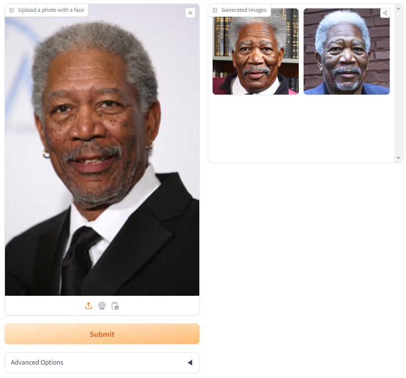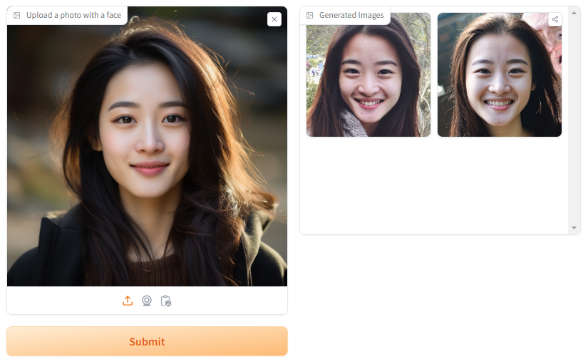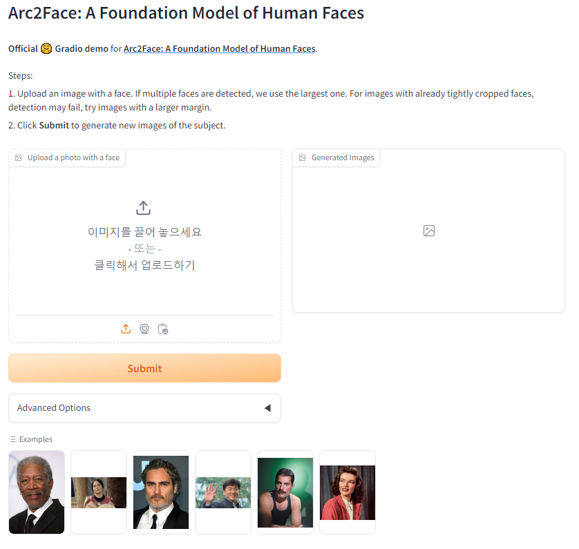 위 링크로 접속하면 Arc2Face 모델의 Demo 버전을 경험할 수 있습니다. 사용방법은 단순합니다. 자신의 얼굴 사진 혹은 인물의 얼굴 사진을 업로드하고 'Submit'을 눌러 생성하면 됩니다.
