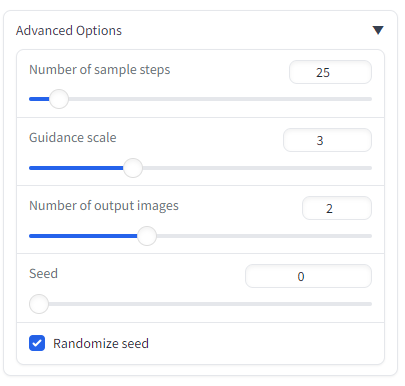 하단에 있는 Advanced Options를 이용해 생성하는 이미지의 값을 조절할 수 있습니다. Number of sample steps의 값을 높이면 좀 더 퀄리티 높은 이미지를 생성할 수 있습니다.