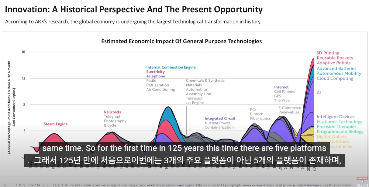 지난 125년간 세계 경제는 약 3%의 꾸준한 성장을 이어왔습니다. 1800년대 후반 전화, 전기, 내연기관이라는 3개의 기술 플랫폼이 이 성장을 견인했습니다. 하지만 캐시 우드는 단언합니다. 우리는 지금, 과거와는 비교할 수 없는 ‘폭발적 성장’의 서막에 서 있다고 말입니다. 그 근거는 바로 동시에 발전하고 있는 5개의 거대한 혁신 플랫폼입니다.