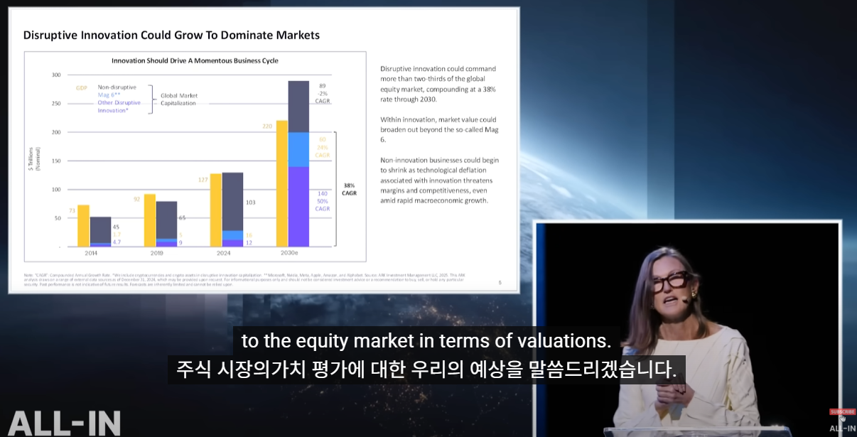 지난 몇 년간 시장은 소위 ‘매그니피센트 6’(Mag 6)로 불리는 거대 기술 기업들이 주도해왔습니다. 투자자들은 불확실성 속에서 가장 현금이 많고 안정적인 이들 기업으로 몰려들었고, 그 결과 이들 기업의 가치는 3배나 치솟았습니다. 하지만 캐시 우드는 바로 이 지점에서 시장의 ‘거대한 착시’를 지적합니다. 같은 기간 동안, 세상을 근본적으로 바꿀 ‘진정한 파괴적 혁신’ 기업들의 가치는 고작 30% 오르는 데 그쳤다는 것입니다.