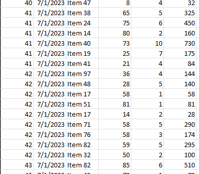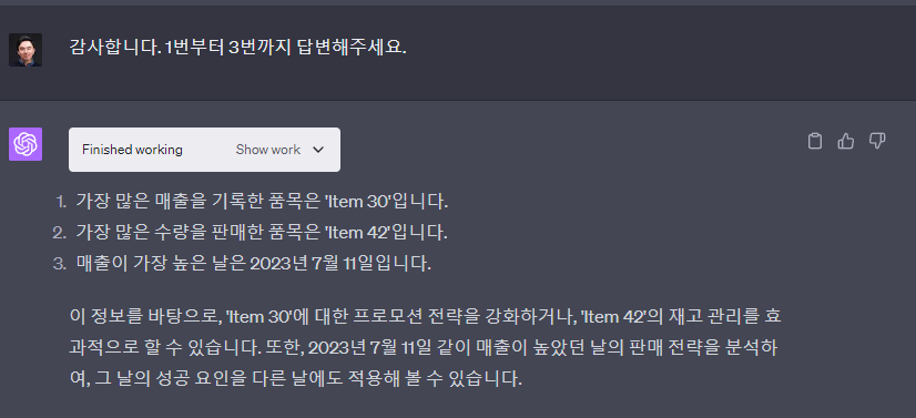이 정보를 바탕으로, 'Item 30'에 대한 프로모션 전략을 강화하거나, 'Item 42'의 재고 관리를 효과적으로 할 수 있습니다. 또한, 2023년 7월 11일 같이 매출이 높았던 날의 판매 전략을 분석하여, 그 날의 성공 요인을 다른 날에도 적용해 볼 수 있습니다. -GPT4 선생-