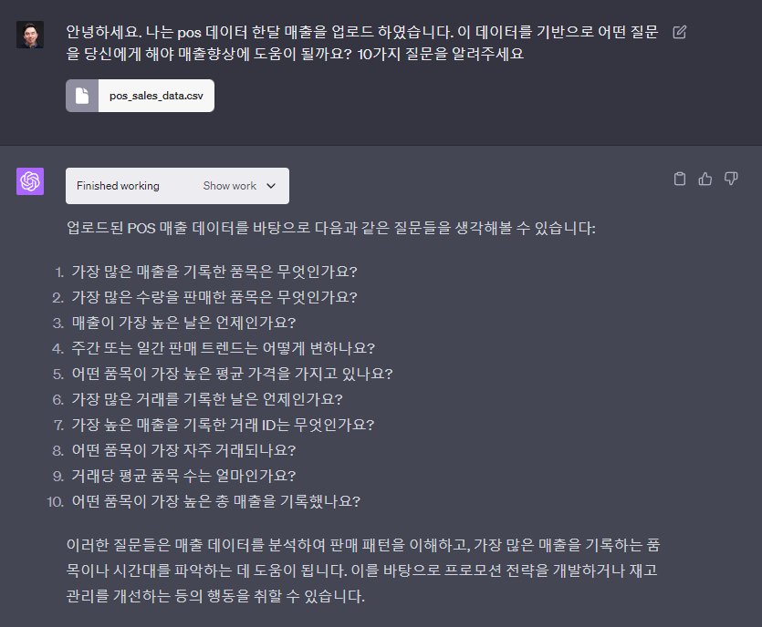 한달간의 POS 데이터를 업로드하고 이를 통해서 매출향상을 위한 10가지 질문을 알려달라고 했습니다. 이것은 예제이지만 이미 본업에서 고민하시는 포인트들이 있으시다면 해당 데이터를 올리시고 그 고민되시는 질문을 올리시면 됩니다.