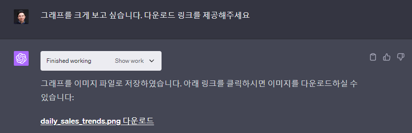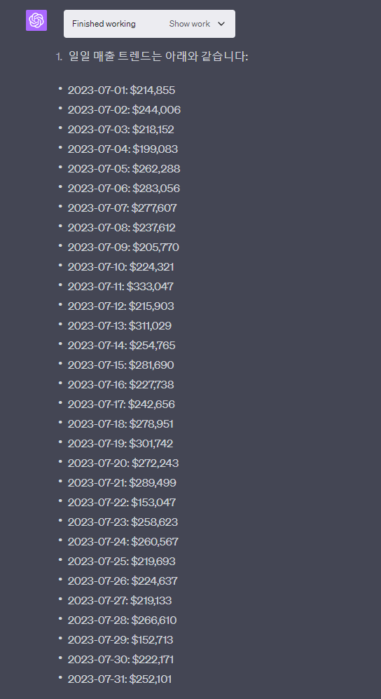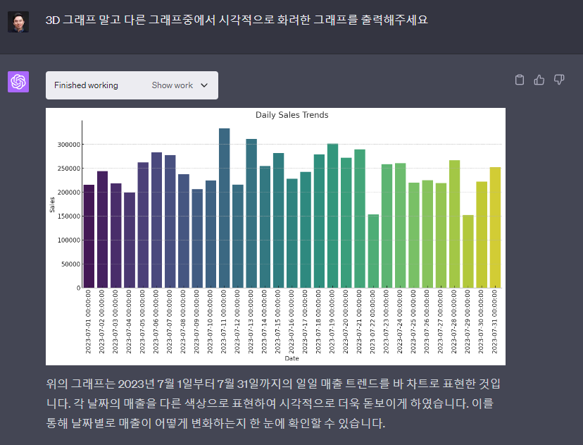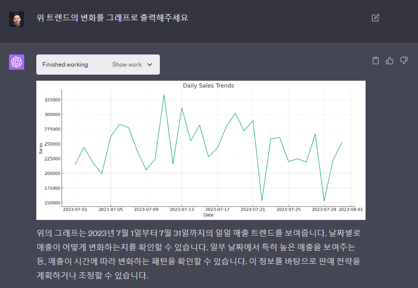 일일 매출 트렌드에 대해서 정말 나열을 해줍니다. 그런데 이렇게 보는게 불편할수밖에 없기 때문에 그래프로 요청을 했습니다. 그럼 그래프로 표현을 바로 해줍니다.