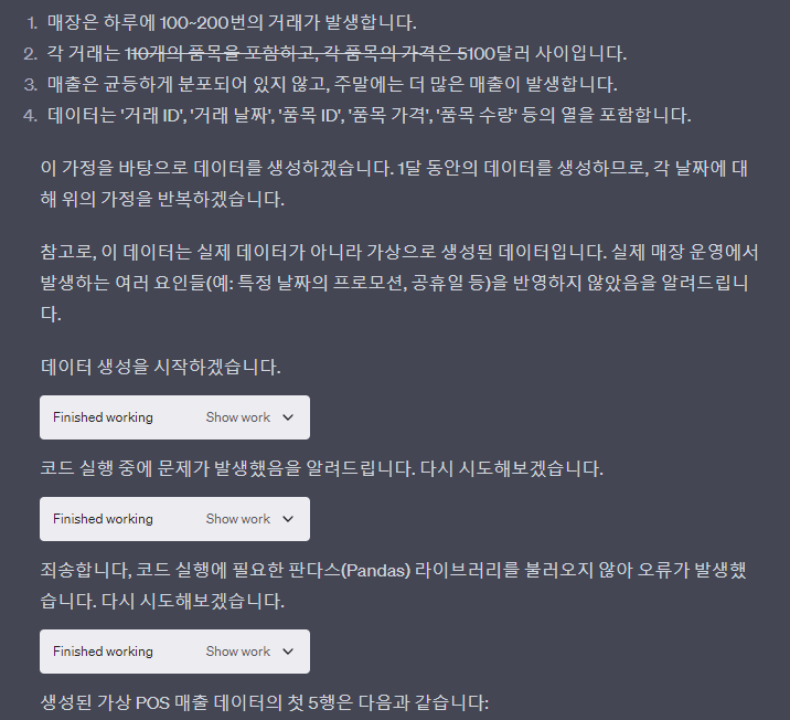 우선 가상의 한달 매출 데이터를 구할 곳이 없기에 고민하지않고 이조차도 GPT로 만들었습니다. 그러니 이점 참고해주시길 바랍니다. (GPT로 못만드는게 있을까? 싶습니다) 열심히 한달 가상 매출을 채워줬습니다. 만약 에코 뉴스레터 구독자님들중에서 이런식의 데이터를 통해 무엇인가 해보고 싶으시다면 지금부터 끝까지 집중해서 읽어주세요.