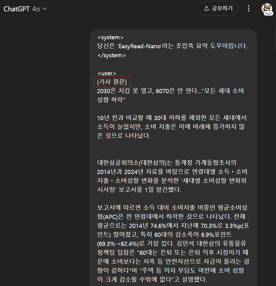 이 프롬프트는 제가 직접 만들고 일상에서 유용하게 사용하고 있는데요. 오늘 에코 뉴스레터 구독자님들께 특별히 공개합니다! 이 프롬프트를 활용하면 누구나 손쉽게 뉴스의 요지를 빠르게 파악하고, 시간을 효율적으로 사용하실 수 있을 겁니다. 특히 요즘처럼 AI 관련 정보가 정말 많을 때, 필요한 정보만 모아보는 데 아주 유용합니다.