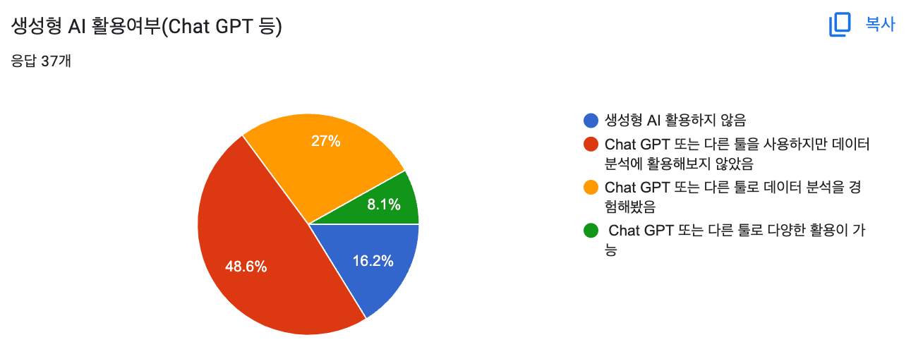 하지만 아직 대학에서는 Chat GPT로 데이터 분석 강의를 하는 학생들이 아직 저희 학교에 일부 학생들의 의견이지만 아직도 활용하지 않는 학생들을 찾을 수 있었습니다. 좀 더 인터뷰를 해보니 어떻게 활용해야할지 몰랐고, 아직 분석에 대한 프로세스가 정립이 안된 것들을 알 수 있었습니다. Chat GPT의 등장으로 환호했던 몇몇 시니어 동료들과는 많이 상반된 느낌이었습니다.