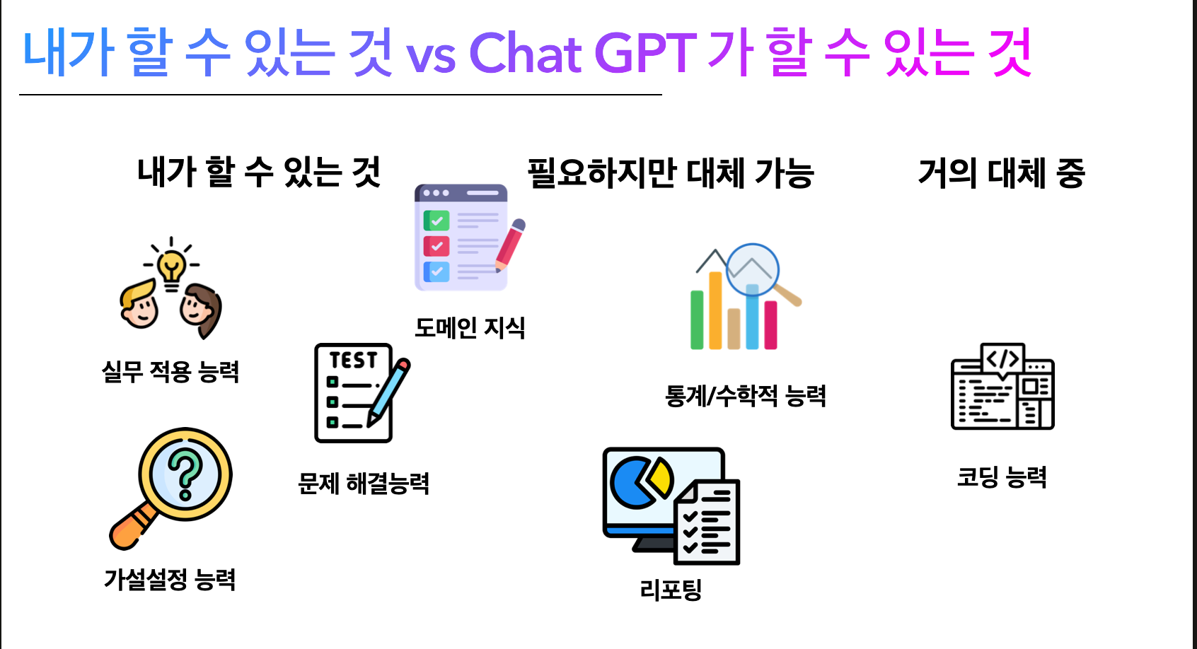 이미 통계/수학적인 능력이라던가 / 리포팅부분에서는 많은 분들이 생성형 AI를 의존하거나 자동화를 많이 한 사례들을 보고, 코딩능력은 이미 주니어 능력치를 넘은 것을 알 수 있습니다. 물론 사람이 아직은 확인을 해야한다고 생각은 합니다. 그리고 점점 알아가는 데이터가 많아지면서 도메인지식이라던가 실무에 대한 이해도가 높아지긴하는데 아직 대체할 수 없는 부분은 실무적인 경험 / 원초적인 문제 해결 능력 / 가설설정 능력입니다.