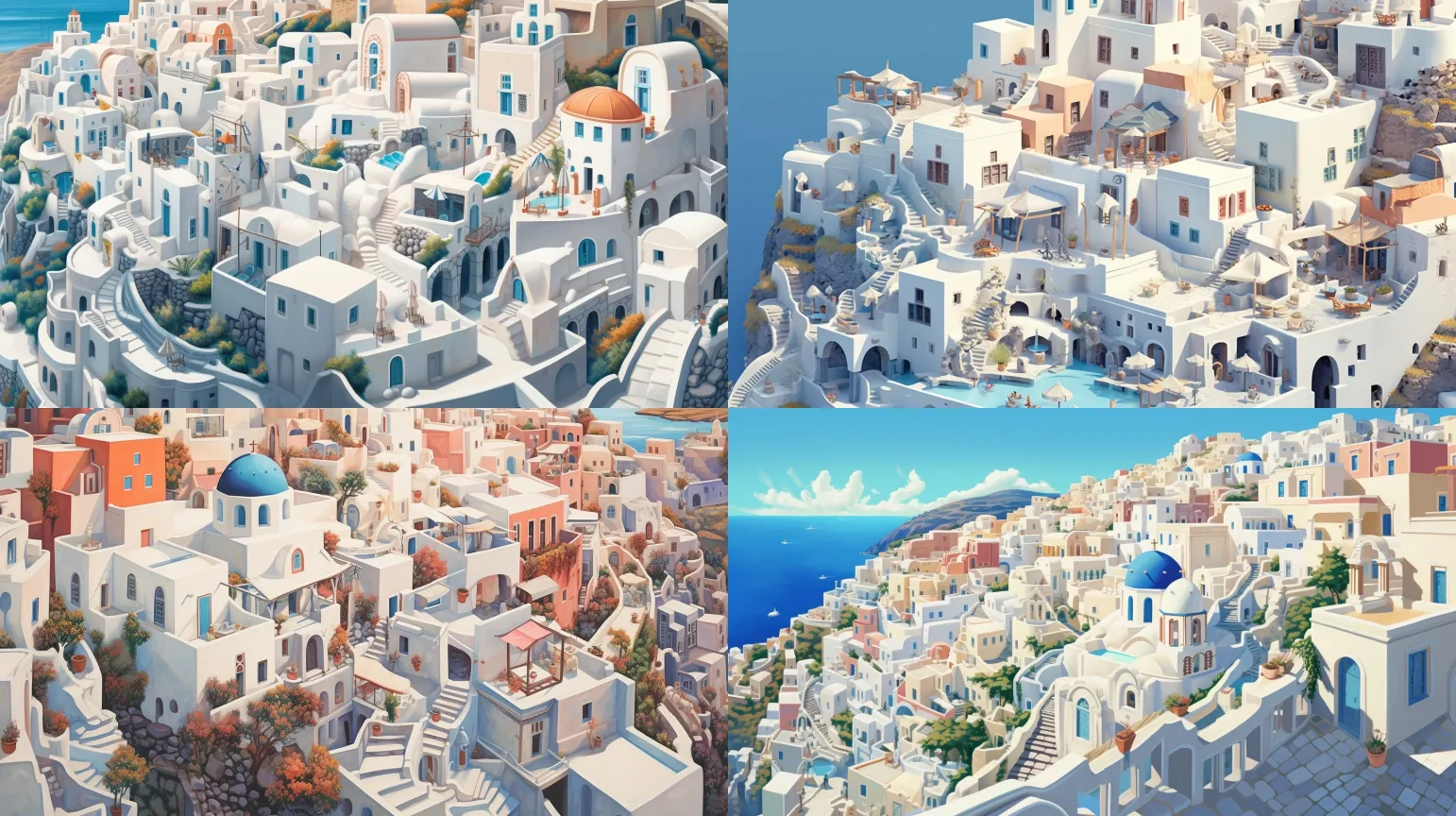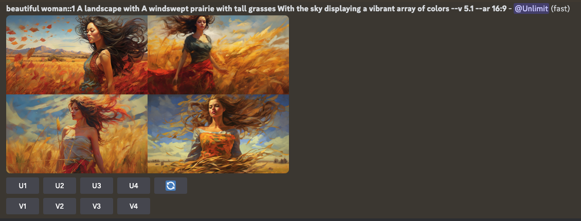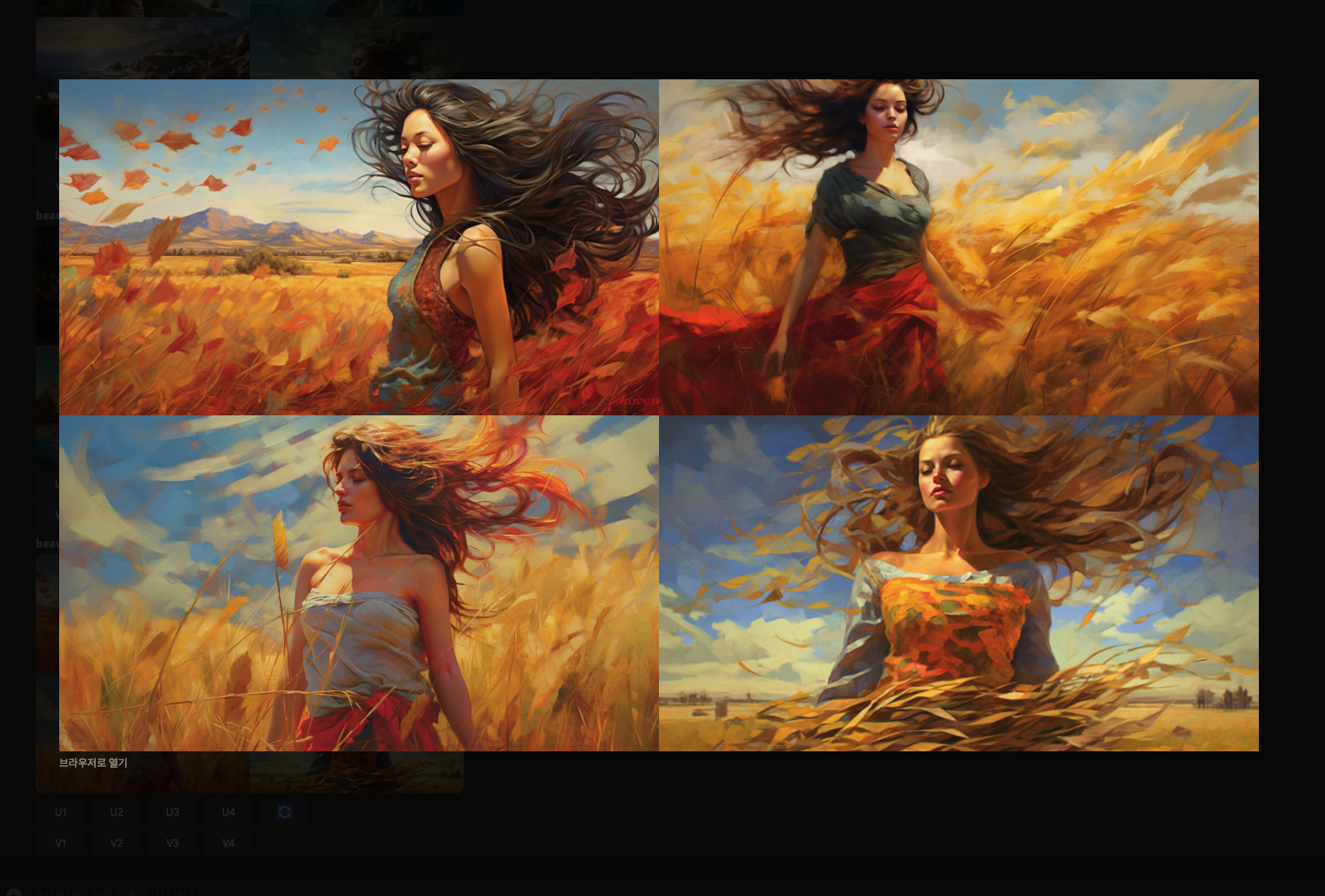 오늘 첫번째로 알려드릴 내용은 미드저니에서 U버튼 사용하지 않는 방법입니다. 이게 무슨 말인지는 미드저니를 써보신 분들이라면 다 아실겁니다. 텍스트로 이미지를 생성하면 4개의 이미지가 생성됩니다. 그 중에 내가 맘에드는 이미지를 하나 골라서 U1, 2, 3, 4 버튼을 눌러 하나씩 재생성해서 다운 받았습니다.