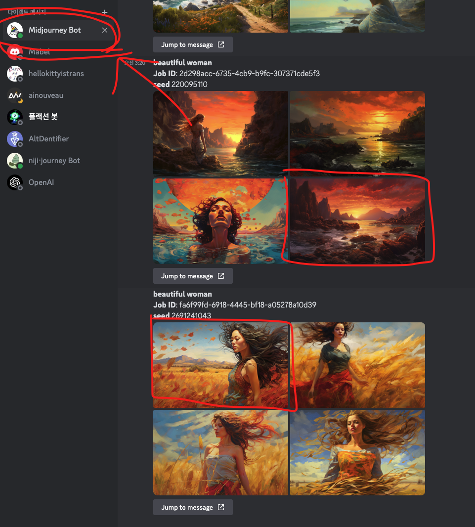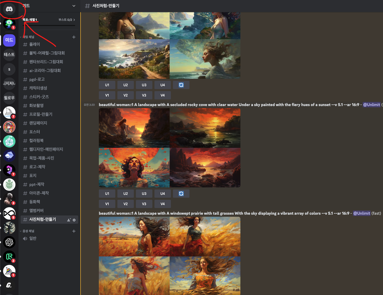 지금부터는 이미지를 생성하면 미드저니 봇에 내가 생성한 그림들이 바로 쪼개져서 하나씩 다운받을 수 있게 세팅되었습니다. 정말 저는 이 기능으로 시간을 훨씬 아끼게 되었습니다.