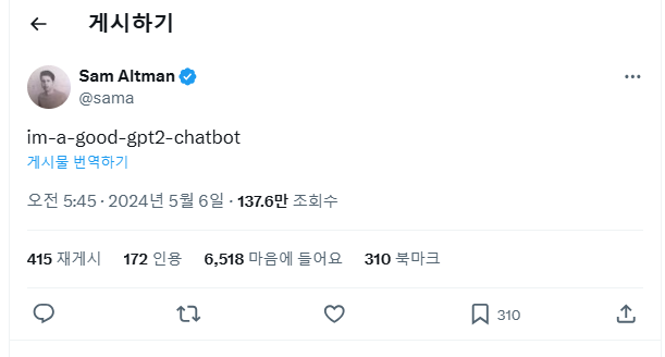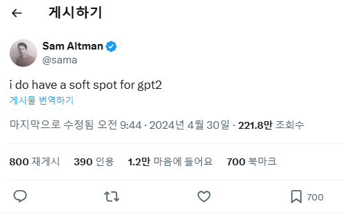 현재 오픈AI는 GPT2 모델에 대해 공식적인 입장을 밝히지 않고 있는 상황입니다. 다만, 샘 알트만이 의미심장한 글을 트위터에 게시했습니다.