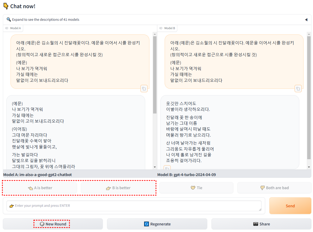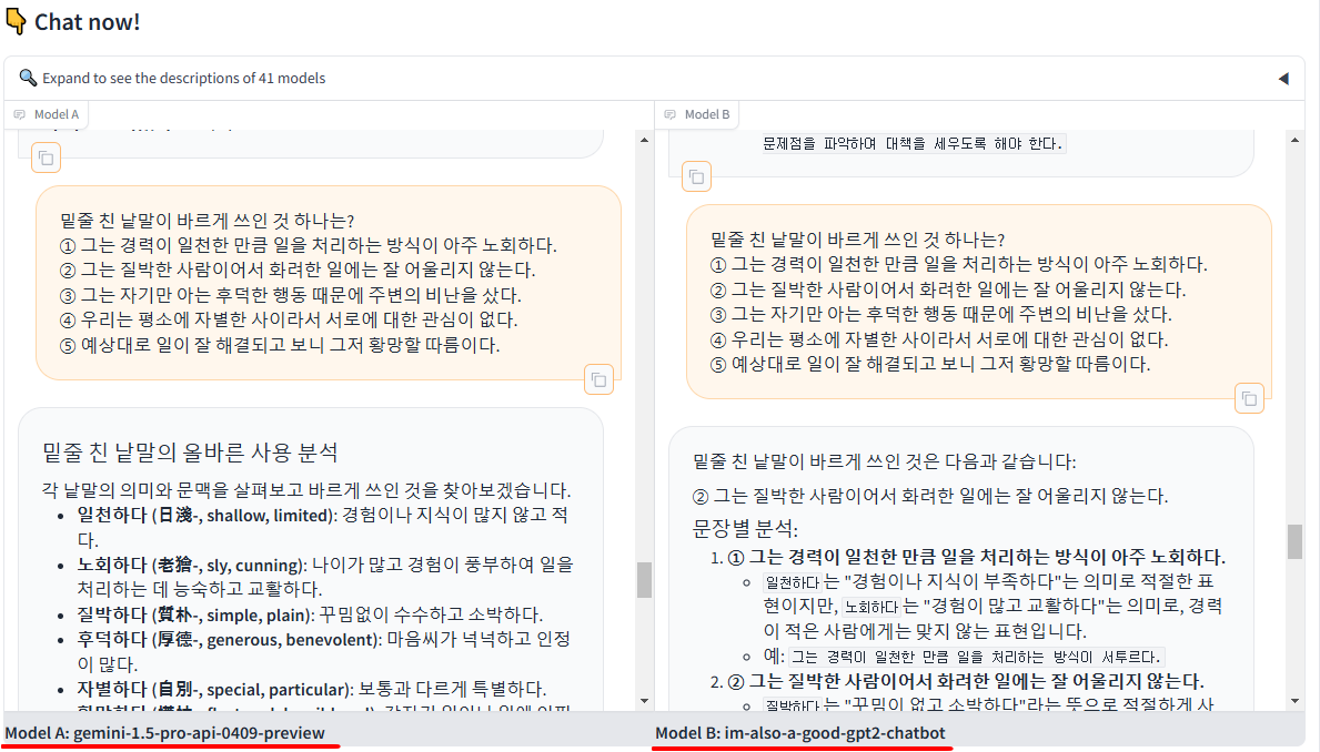 웹 사이트 링크는 하단에 첨부해 두겠습니다. 이 사이트는 AI 벤치마크로 등록된 오픈소스 모델을 랜덤으로 테스트할 수 있습니다. 동일한 프롬프트가 입력되며, 더 나은 답변을 한 모델을 선택해 투표하는 방식입니다.