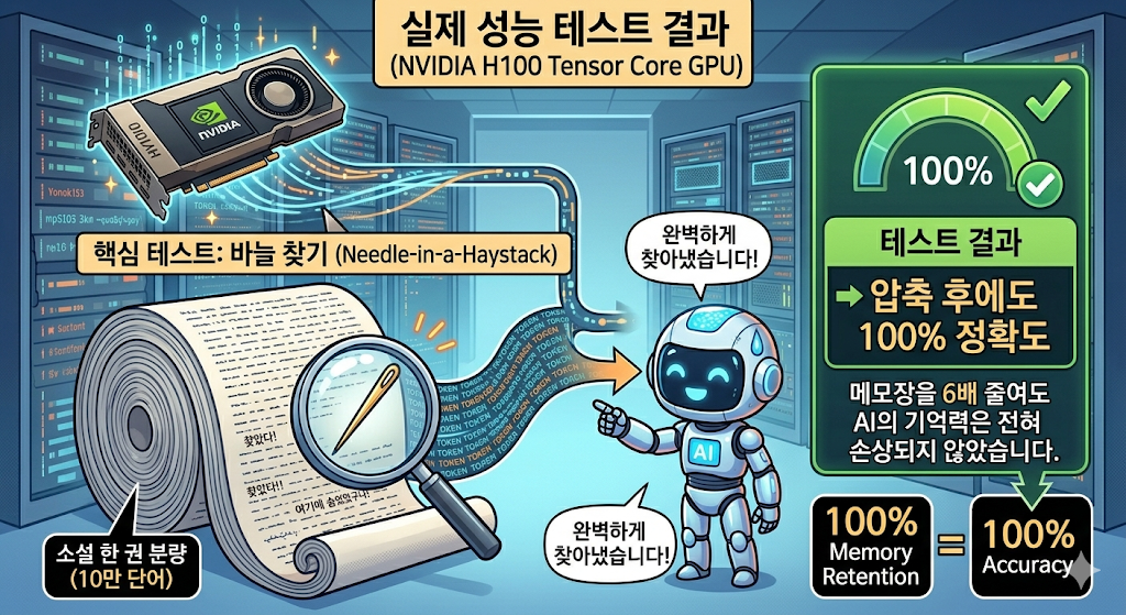 특히 인상적인 건 "바늘 찾기(Needle-in-a-Haystack)" 테스트입니다. 소설 한 권 분량(10만 단어) 속에 숨겨둔 문장 하나를 찾는 건데, 압축 후에도 100% 정확하게 찾아냈습니다. 즉, 메모장을 6배 줄여도 AI의 기억력은 전혀 손상되지 않았다는 뜻입니다.