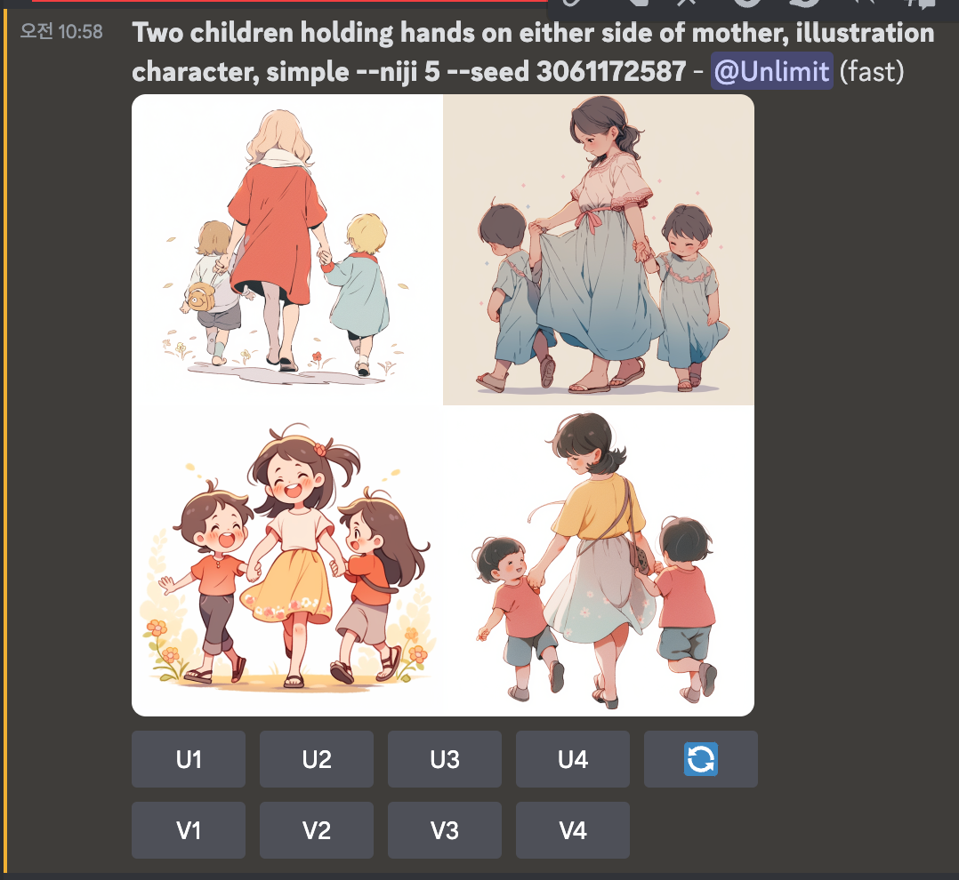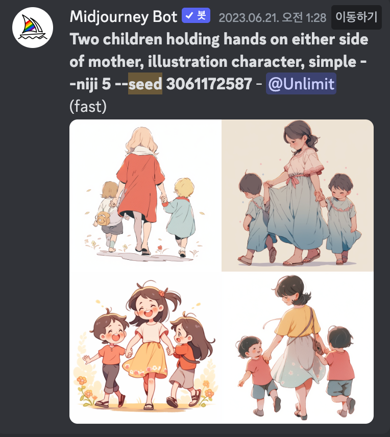 해결책은 '--Seed' 지정값를 사용하는 것입니다. 원하는 프롬프트를 작성하시고 "–seed [숫자]"를 입력하기만 하면 됩니다. 이 동일한 프롬프트(및 시드값)를 사용하면 알고리즘의 임의적인 값을 줄이고 원래 시드로 생성된 이미지와 정확한 복사본을 제공합니다.
