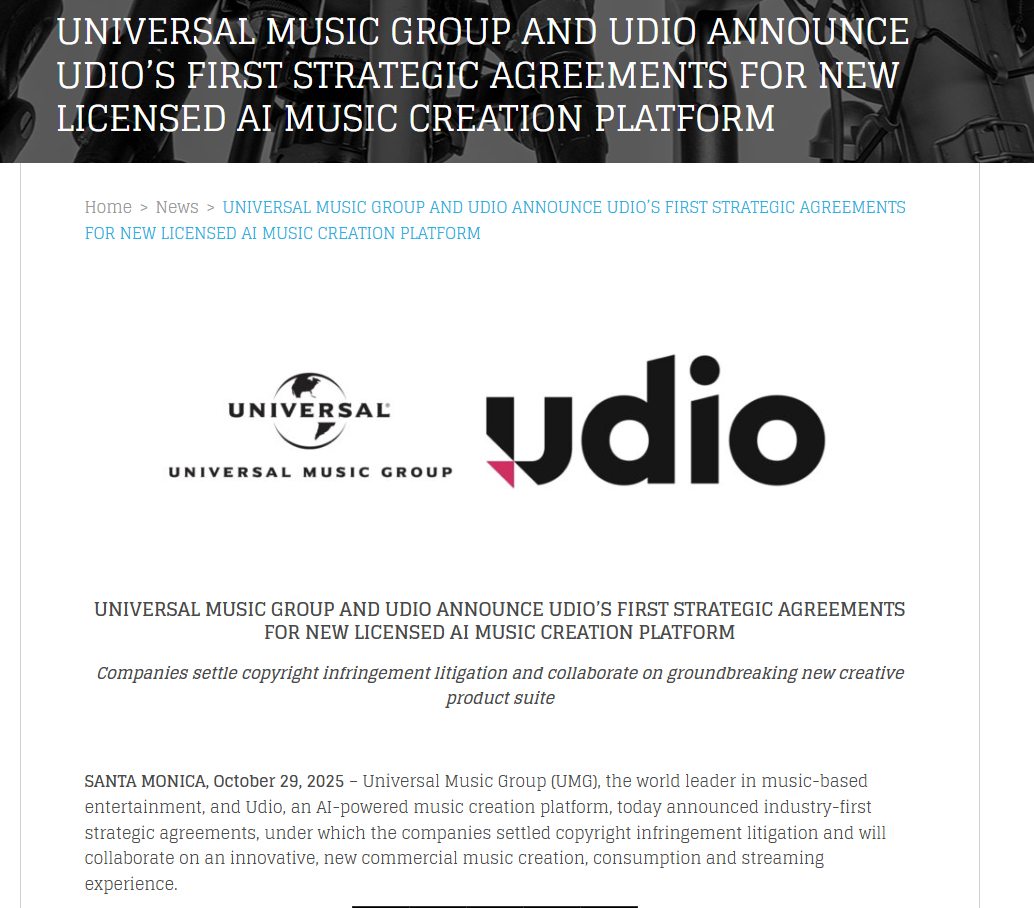 (2) Universal Music Group. (2025). UNIVERSAL MUSIC GROUP AND UDIO ANNOUNCE UDIO'S FIRST STRATEGIC AGREEMENTS FOR NEW LICENSED AI MUSIC CREATION PLATFORM. PR Newswire. https://www.prnewswire.com/news-releases/universal-music-group-and-udio-announce-udios-first-strategic-agreements-for-new-licensed-ai-music-creation-platform-302599129.html