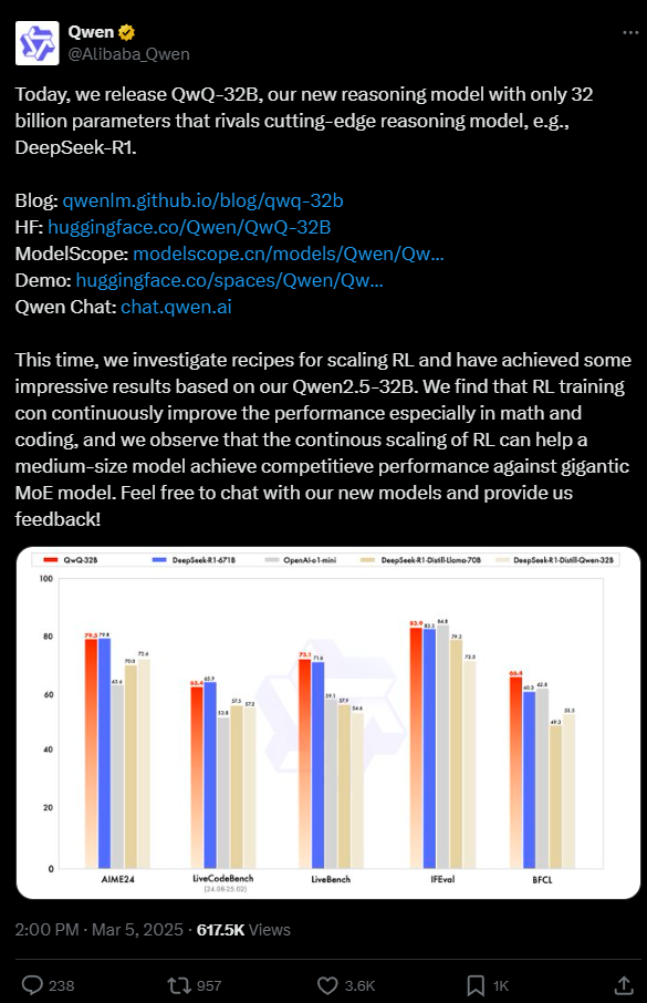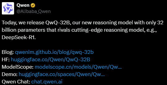 한편 이런 분위기 속에서 중국의 Qwen 팀이 새로운 미드사이즈(reasoning 중심) 모델인 QwQ-32B를 공개했습니다. 딥시크로 얼마전까지 충격으로 난리였는데 오픈AI와는 다른 길을 걷는 소식에 사람들은 어떤 반응을 보일지도 함께 확인해보겠습니다.