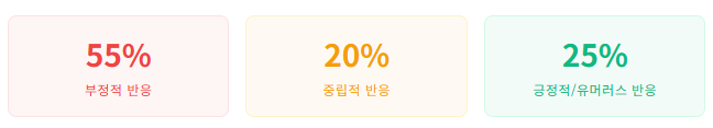 X 커뮤니티 많은 댓글들을 분석해보면 역시 분위기는 싸늘하다는 것을 알 수 있습니다. 55% 절반이 넘는 사람들이 부정적인 반응들을 보이고 있습니다. 특히 사람들이 이렇게 비판하는 이유와 관련한 댓글을 찾아보면...