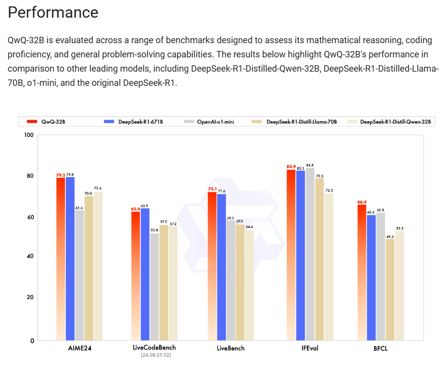 - DeepSeek-R1(671B 파라미터 중 37B 활성) 대비, 훨씬 적은 파라미터(32B)로 유사한 수준 달성