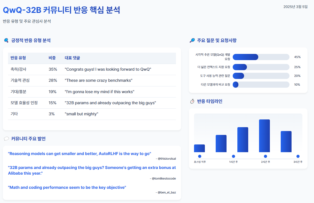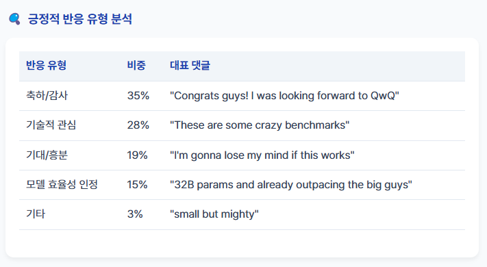 딥시크 충격이 아직 가시질 않았는데 훨씬 적은 파라미터(32B)로 유사한 수준을 달성했다는 것도 놀랍습니다. 커뮤니티 반응은 어떨까요? 오픈AI와 비교해보면 더 흥미롭게 보실 수 있습니다.