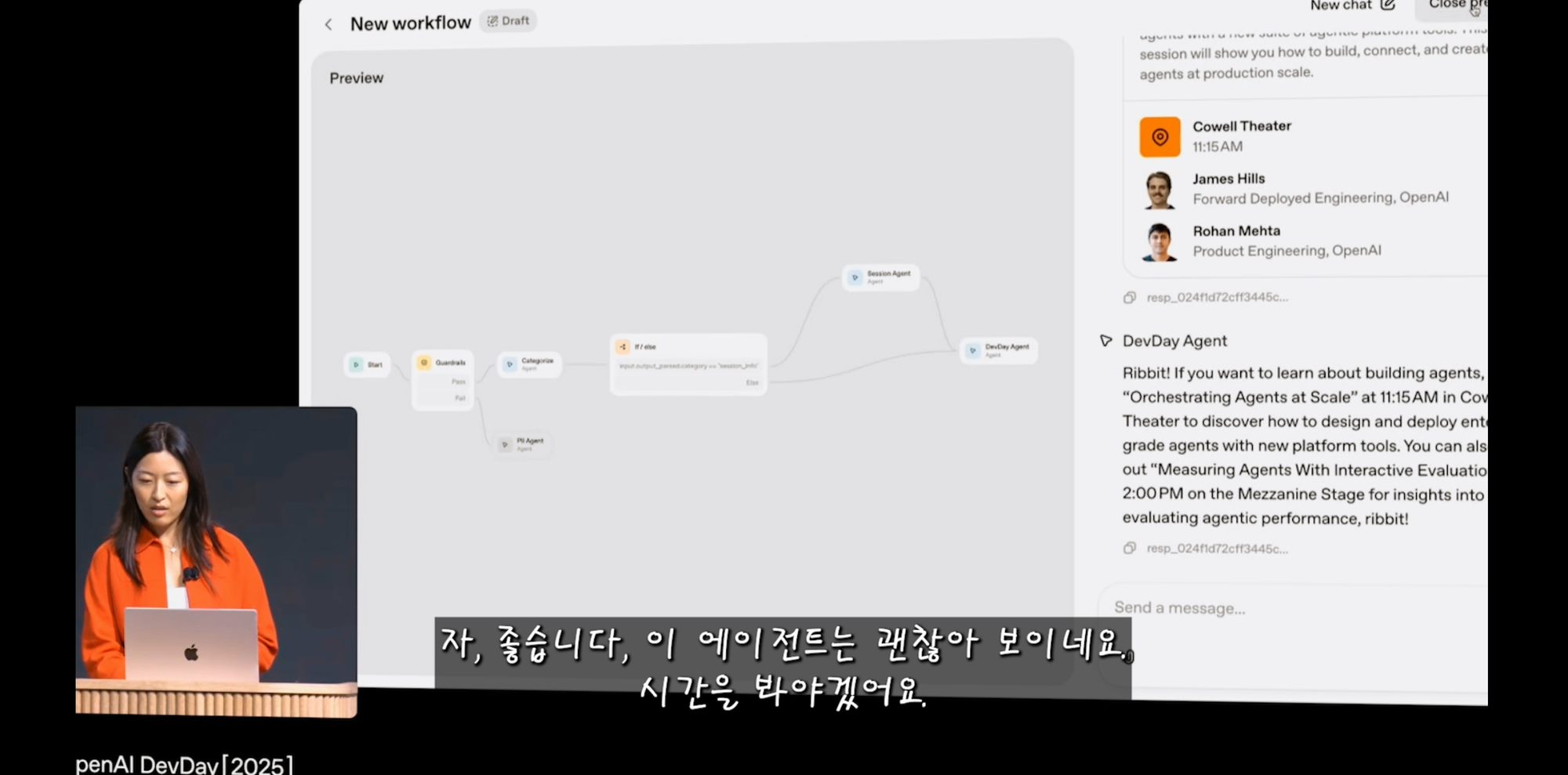 행사장에서 개발자가 단 8분 만에 실시간으로 ‘여행사 AI’를 구축하는 장면은 이 많은 사람들에게 박수를 받았습니다. ‘항공권 문의’와 ‘여행 일정 문의’를 스스로 분류하고, 각기 다른 전문 지식(웹 검색, 문서 파일)을 활용하며, 심지어 ‘위젯’이라는 시각적 결과물까지 만들어내는 복잡한 에이전트가 코딩 한 줄 없이, 단지 노드를 연결하는 것만으로 완성되었습니다.