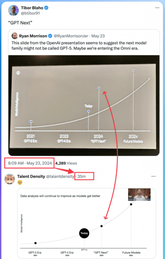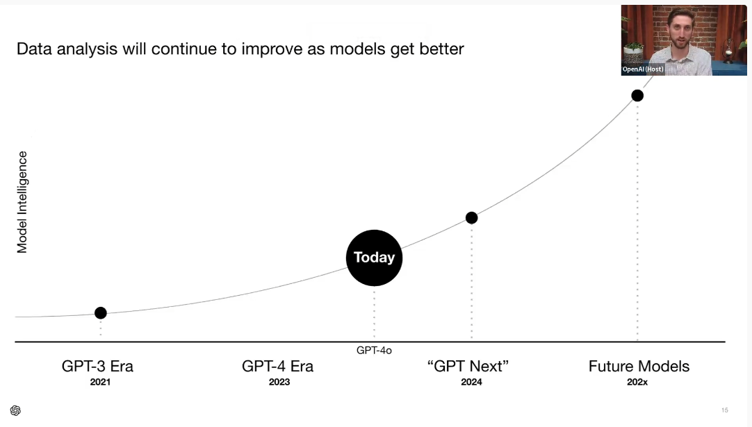 그래프를 살펴보면 현재 GPT-4o의 위치와 다음 모델이 2024년에 GPT-Next로 출시할 예정인 것을 확인할 수 있습니다. 2023년 5월 비공식 프레젠테이션에서 공개된 그래프와 비슷한 모양입니다.