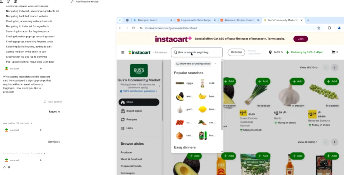 - 식료품 주문: Instacart 등을 직접 브라우저로 띄워서 장바구니에 품목 추가, 결제 전 사용자 확인