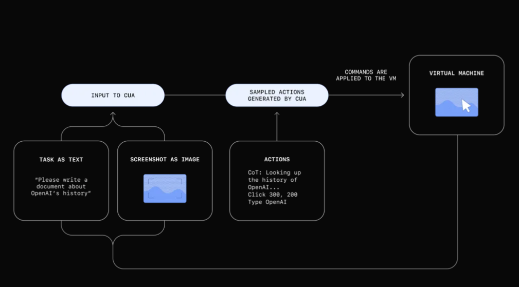- CUA는 GPT-4o를 기반으로 강화 학습(Reinforcement Learning)과 시각 인식 기술을 결합하여 개발되었습니다. Chain-of-Thought 방식을 통해 추론하고, 웹 브라우저 스크린샷을 통해 상태를 업데이트하며 작업을 수행합니다.