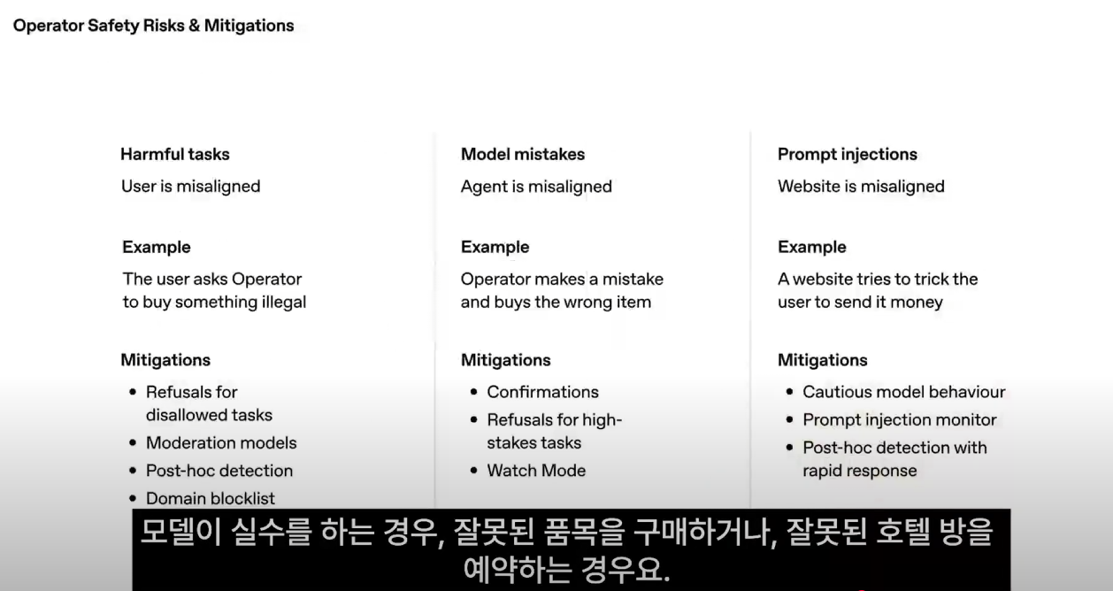 오퍼레이터는 단순 대화형 AI보다 더 큰 위험성을 지닙니다. 실제로 사용자 대신 웹에서 ‘실행’을 하기 때문이죠. 이에 OpenAI는 다음과 같은 안전 대책을 강조합니다.