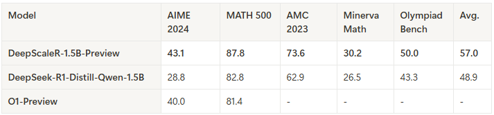 (1) Michael Luo and Sijun Tan and Justin Wong and Xiaoxiang Shi and William Tang and Manan Roongta and Colin Cai and Jeffrey Luo and Tianjun Zhang and Erran Li and Raluca Ada Popa and Ion Stoica. (2025). DeepScaleR: Surpassing O1-Preview with a 1.5B Model by Scaling RL. Notion. https://pretty-radio-b75.notion.site/DeepScaleR-Surpassing-O1-Preview-with-a-1-5B-Model-by-Scaling-RL-19681902c1468005bed8ca303013a4e2