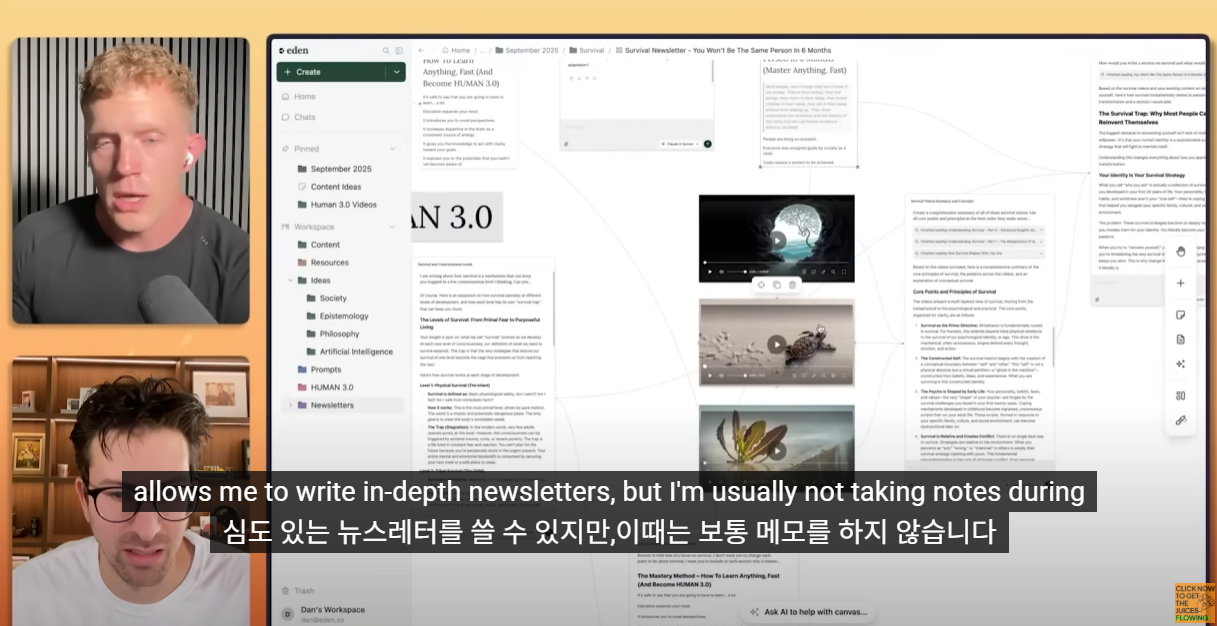 - AI로 지식의 경계를 허물다: 깊이 있는 콘텐츠를 위해서는 방대한 학습이 필수적입니다. 과거에는 몇 시간짜리 강연 영상을 보거나 두꺼운 책을 읽어야만 얻을 수 있었던 지식을, 그는 이제 AI를 통해 단 몇 분 만에 핵심만 흡수합니다. 3시간 분량의 유튜브 영상을 AI에 입력해 핵심 요약과 통찰을 얻고, 이를 자신의 기존 지식과 결합하여 완전히 새로운 관점의 뉴스레터를 써내는 식입니다. 이는 AI가 인간의 학습 능력을 비약적으로 확장시켜, 개인이 소화할 수 있는 정보의 양과 질을 전례 없는 수준으로 끌어올릴 수 있음을 보여줍니다.
