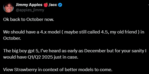(3) Jimmy Apples. (2024). "Ok back to October now. We should have a 4.x model ( maybe still called 4.5, my old friend ) in October. The big boy gpt 5, I’ve heard as early as December but for your sanity I would have Q1/Q2 2025 just in case. View Strawberry in context of better models to come.". X. https://x.com/apples_jimmy/status/1833595024543781088