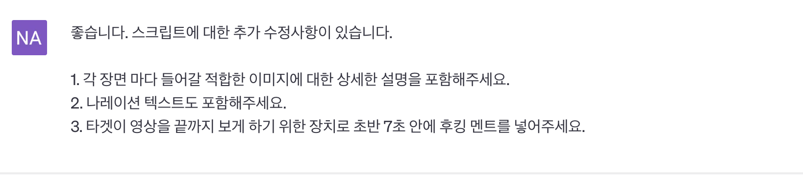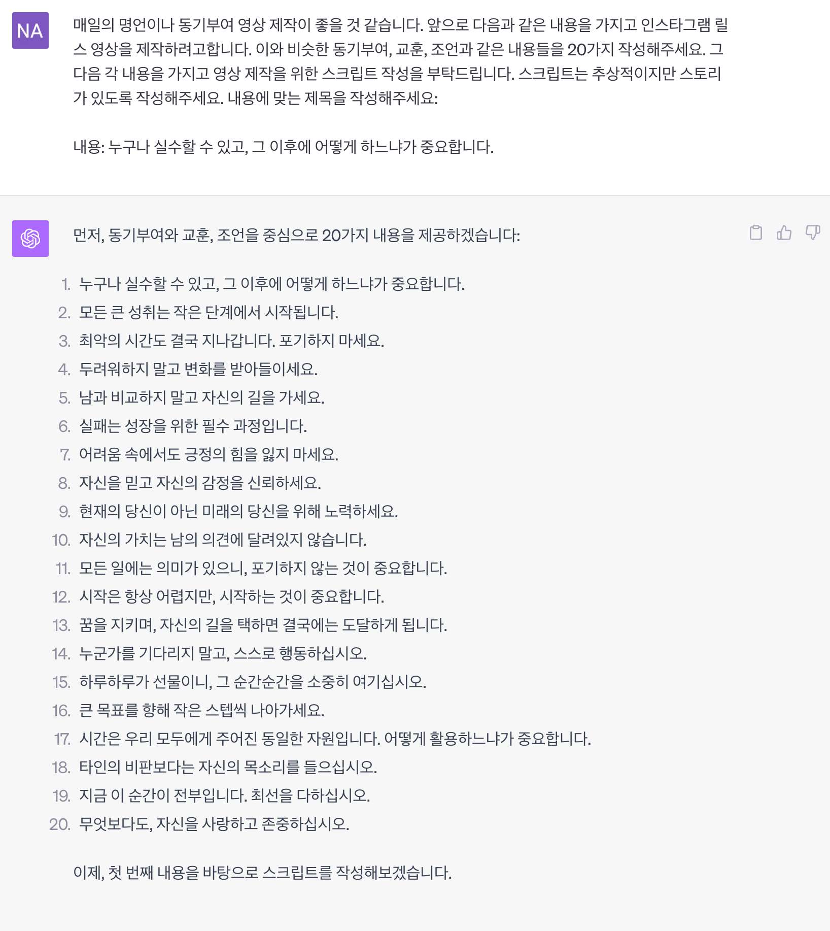 영상을 릴스를 기준으로 제가 필요한 부분에 대해 도움을 받았습니다. 꾸준한 영상 제작을 위한 내용들과 스크립트 작성을 요청했습니다.