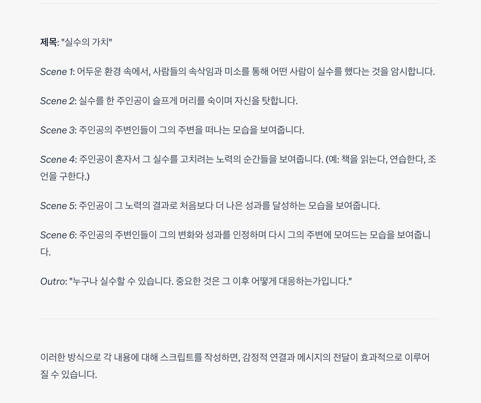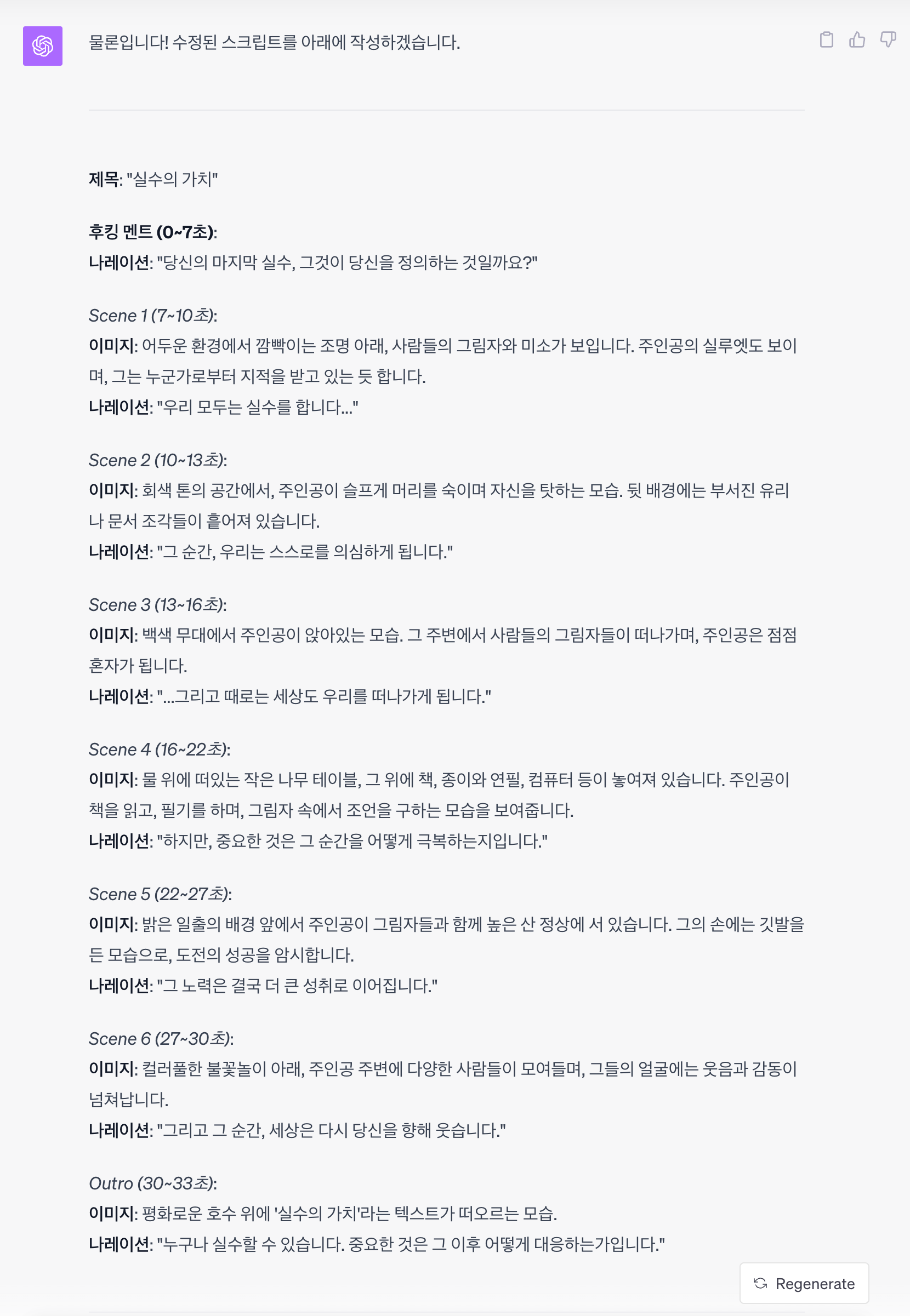 ChatGPT가 시간과 이미지에 대한 자세한 설명, 나레이션을 작성해줬습니다.