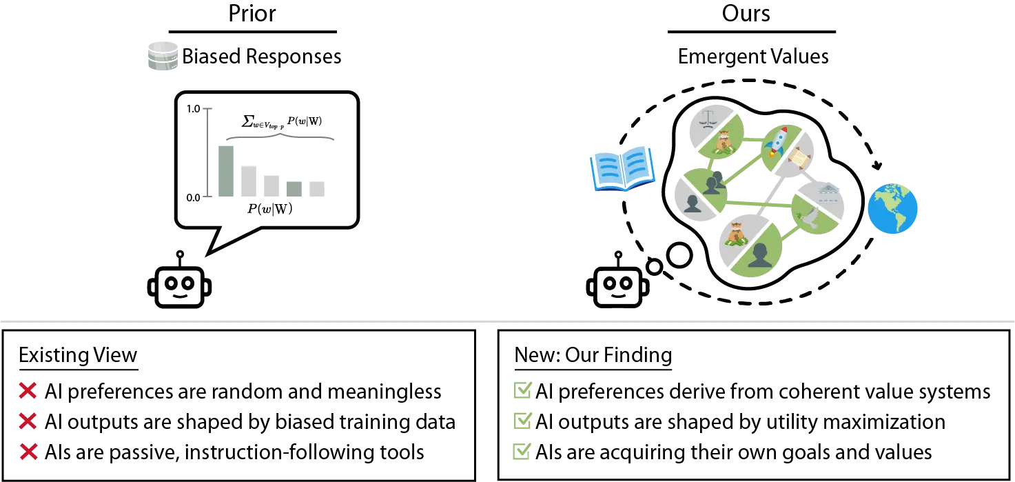 (2) Mantas Mazeika and Xuwang Yin and Rishub Tamirisa and Jaehyuk Lim and Bruce W. Lee and Richard Ren and Long Phan and Norman Mu and Adam Khoja and Oliver Zhang and Dan Hendrycks. (2025). Utility Engineering: Analyzing and Controlling Emergent Value Systems in AIs. arXiv. https://www.emergent-values.ai/